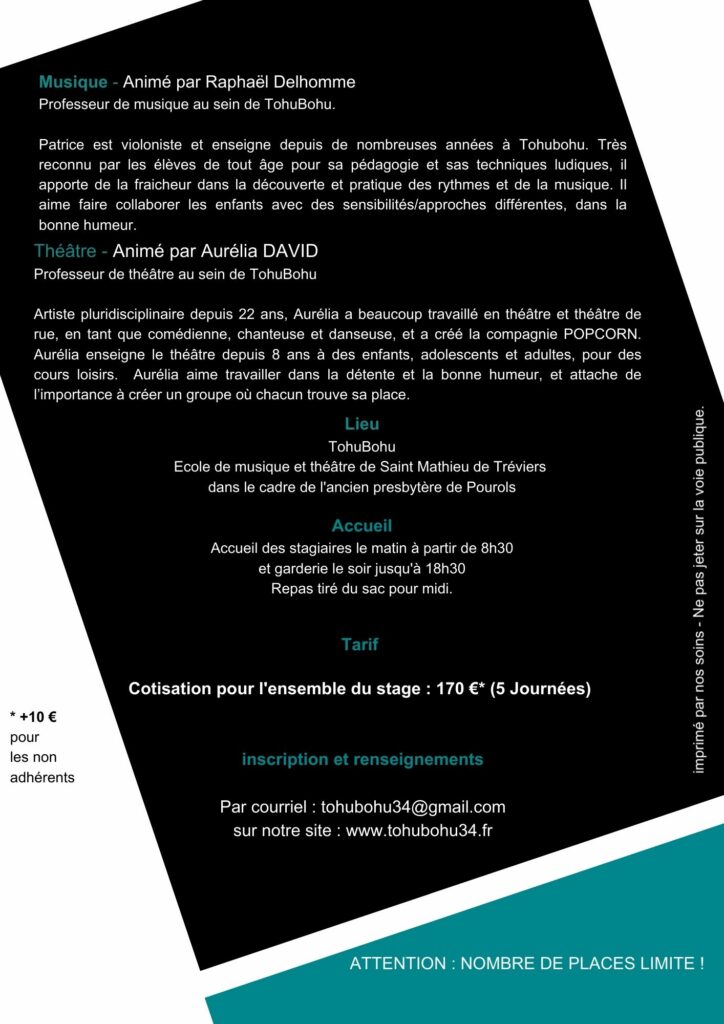 Nous proposons un stage musique et théâtre à partir de 7 ans la semaine du 23 au 27 février 2026. Encadré par Raphaël côté musique et Aurélia côté théâtre, les enfants seront accueillis pour 5 jours de 8h30 à 18h30 avec un pique-nique le midi.